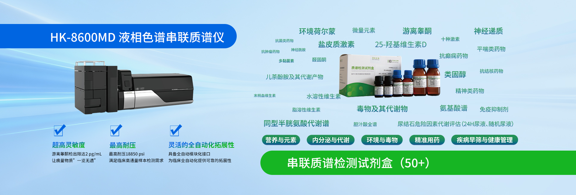 汉库医疗服务:液相色谱串联质谱仪器系统、50多种试剂盒、医检所通过15189认证提供外送检测服务、依托中科院大化所提供科研服务。